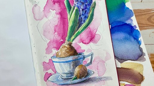 Рисуем ЦВЕТУЩИЙ ГИАЦИНТ акварелью и цветными карандашами