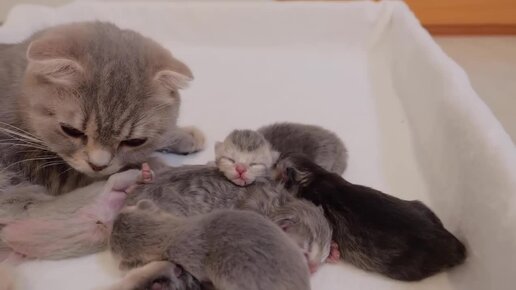 Когда котенок мяукает, мать сразу же пытается его успокоить.