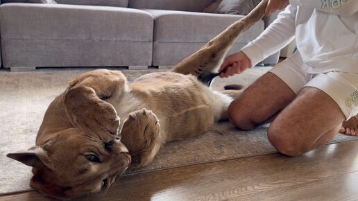 Саша вычесывает пушистые гамаши пумы Месси😂Но Месси тоже помогает