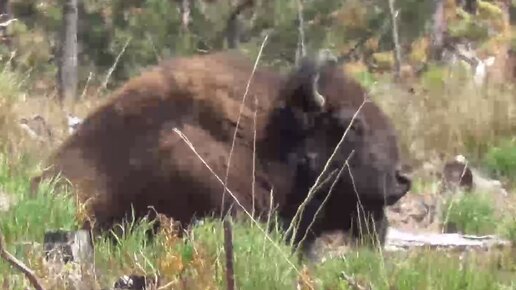 Бизоны на лесной вырубке. Пасутся и отдыхают