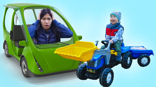 Малыш приехал на помощь к маме на синем тракторе