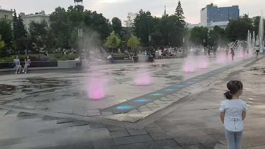 Четырехлетняя девочка сначала побаивалась, а потом решила намочиться на фонтанах под музыку 10.06.22.