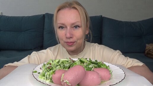Мукбанг очень полезный ПП, сардельки сочные и салат зеленый капустно-огуречно-дедисочный. Еда.