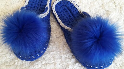 Тапочки "Благородный синий" из трикотажной пряжи.