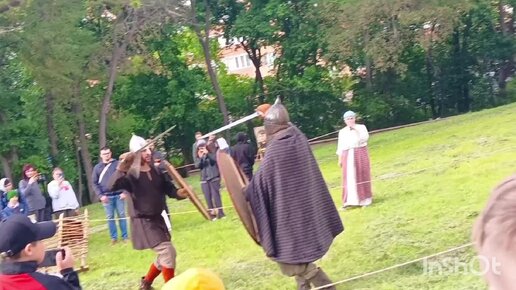 Посмотрели с детьми на рыцарский бой. Кирилл дождался своей очереди и тоже участвовал в бою.