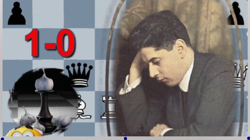 Капабланка - Яновский, 1924, 1-0 - индийская атака, сицилианский вариант. Капа жертвует качество 45.♖xe5 Давиду Яновскому с победой