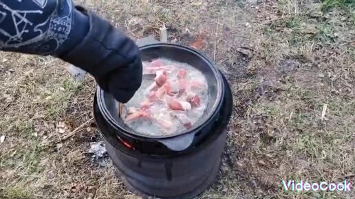 Жаренный картофель с мясом на костре в чугунной сковороде.