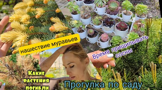 Прогулка по саду. Прищипка сосен. нимфеи, клематисы розы. Погибшие растения