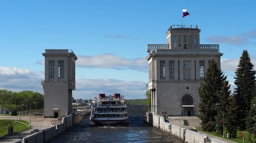 Теплоходы "Огни большого города" и "Феликс Дзержинский" проходят шлюз №16 Городецкого гидроузла