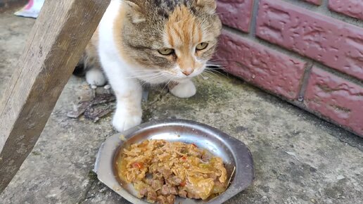 Бездомная кошка не отпускает нас домой с дачи, радуется, кувыркается и просит ее покормить. Накормили Машку перед выездом Мираторг и Гурмэ