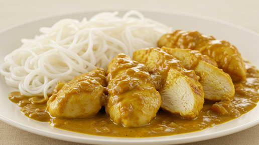 Вкусное сочетание: куриная грудка в карри и рисовая лапша на одной тарелке!