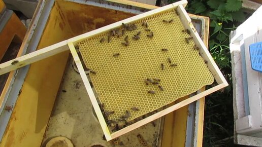 малоформатный улей на пасеке - отстроили три рамки, дал еще вощину, в магазине напрыск в рамках