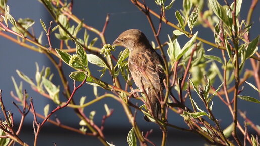 Домовые воробьи ( Passer domesticus) самец и самка, кормятся тлёй на соцветиях дёрена.
