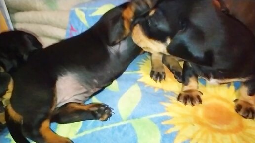 Они готовы сгрызть друг друга. Щенкам уже 20 дней. Таксы в миниатюре.