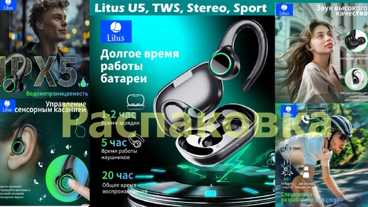 Litus U5 - Распаковка спортивных TWS наушников с ушным крюком... не для моих ушей...