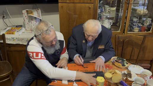 Фёдор Тимофеевич подписывает флаги для Героев СВО