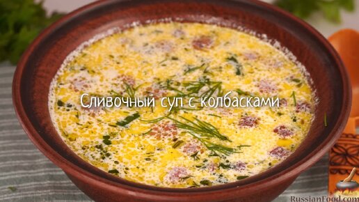 Нежный, с ароматом копченостей. Сливочный суп с колбасками