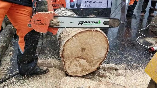 Самая мощная электропила перепиливает березу 35-45 см толщиной