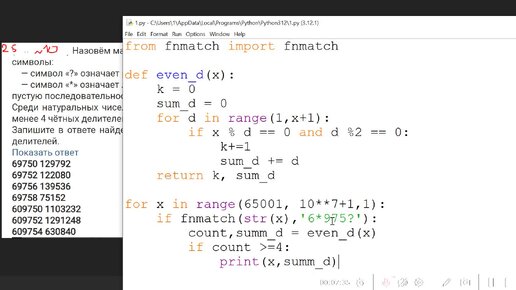 ЕГЭ, информатика, задача №25 для тренировки. Ищем количество и сумму четных делителей чисел по маске - пишем функцию в Python. № 7082