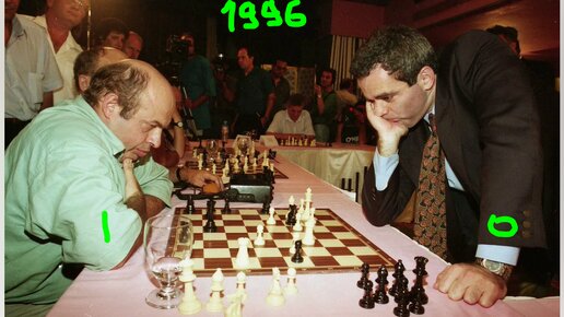Почему-то эта партия, в которой новичок Натан Щаранский черными бьет Каспарова что есть сил, доставляет эстетическое удовольствие, 1996