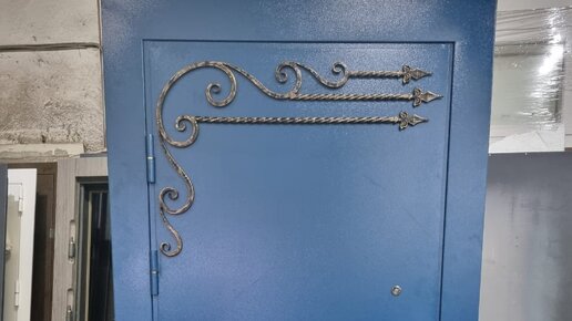 Входная металлическая дверь с ковкой синего цвета.