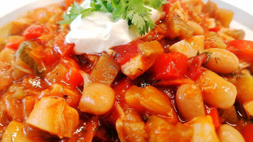 Овощное рагу с фасолью и копченой куриной грудкой