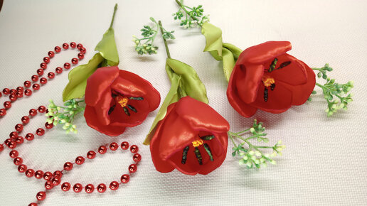 Как сделать тюльпаны 🌷🌷🌷 из атласной ленты. Мастер-класс по созданию цветов из атласных лент.