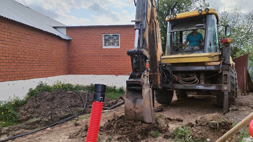 Копаем траншею для прокладки кабеля с помощью экскаватора-погрузчика.