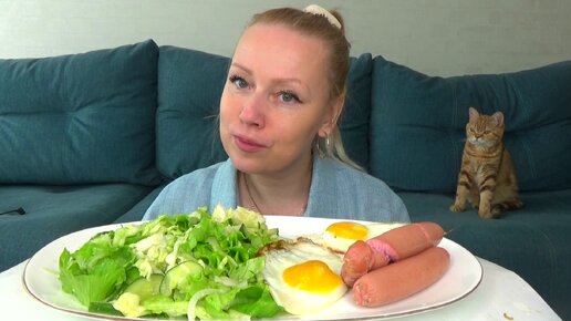 Мукбанг разгрузочный ПП. Салат капустно огуречный, Яйки жареные, сосиски с горчицкой. Еда.