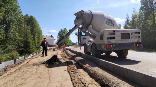 Готовим бетон на объекте для установки дорожных бортов с помощью самоходного миксера.
