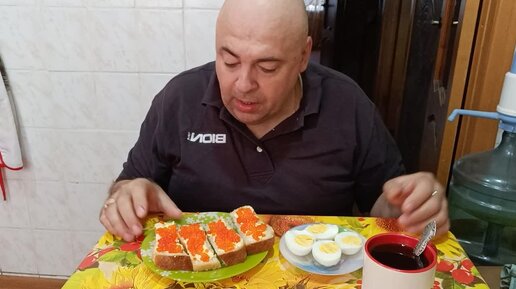 Мукбанг. Завтрак. Бутерброды с икрой и варёные яйца. Раннее пробуждение после Лиги Чемпионов.