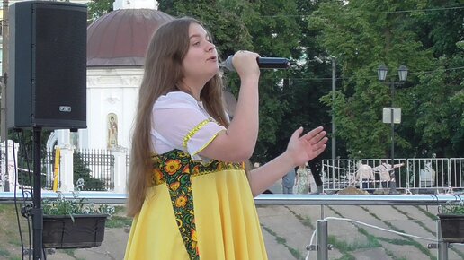 Девушка поёт песню: Матушка Россия, я верую в тебя