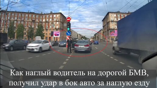Как наглый водитель на дорогой БМВ, получил удар в бок авто за наглую езду