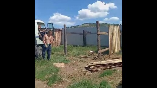 Корова приехала в приют, выгружаем. Делаем ей загончик.