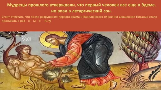 Сон Адама - мудрецы прошлого утверждали, что первый человек ещё спит в Эдемском саду, а в материальный мир упала только Ева (ребро Адама).