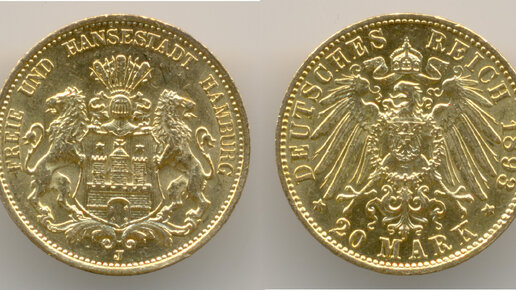 Нумизматика. Золотая монета. Германия, Гамбург, 20 марок 1893 г.