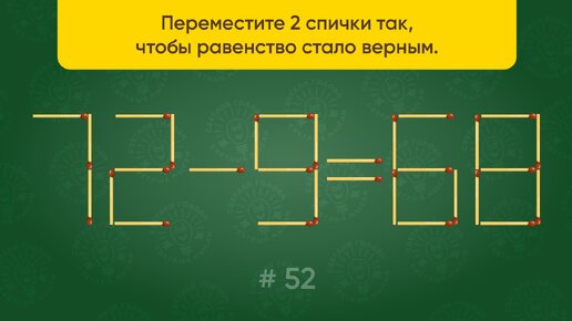Задача со спичками № 52. Переместите 2 спички так, чтобы равенство стало верным.