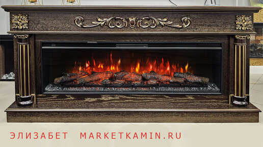 Классический электрокамин под TV. Широкий очаг с дровами, дуб, золото, шикардос