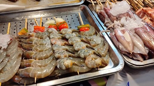 Еда на рынке в Таиланде - огромные креветки, рыбка, суши, устрицы и другие деликатесы. Пхукет 2024.