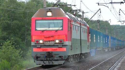"С песочком". 2ЭС6-035 "Синара" с контейнерным грузовым поездом следует через о.п. Большая поляна