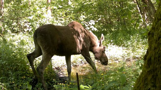 Лето. Лоси, косули, кабаны пасутся у лесного ручья