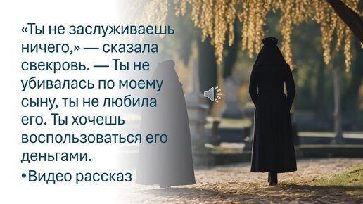 «Ты не заслуживаешь ничего,» — сказала свекровь. — Ты не убивалась по моему сыну, ты не любила его. Ты хочешь его деньги. Видео рассказ