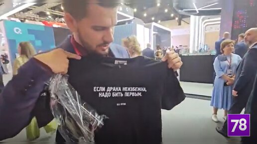 «Если драка неизбежна»: на ПМЭФ выстроилась очередь за футболками с цитатами Путина
