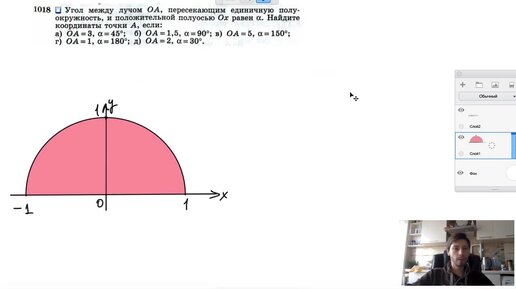 №1018. Угол между лучом ОА, пересекающим единичную полуокружность, и положительной полуосью Ох