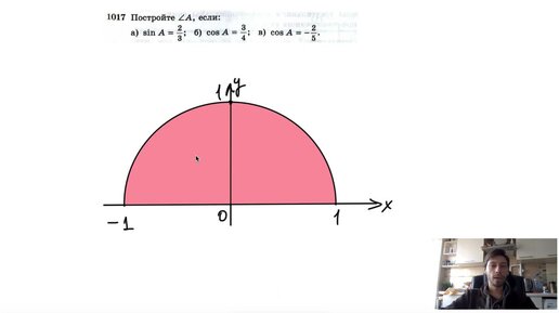 №1017. Постройте ∠А, если- a) sinA=⅔; б) cosA = ¾; в) cosA = -2-5.