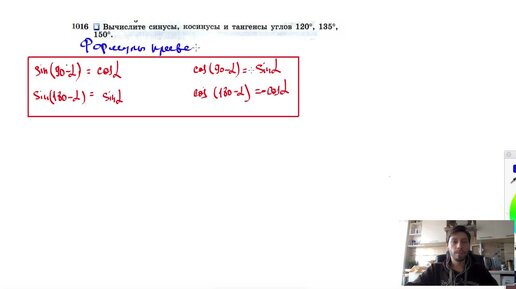 №1016. Вычислите синусы, косинусы и тангенсы углов 120°, 135°, 150°.