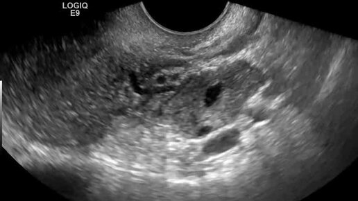 Видео: Поперечное сканирование матки. Левый яичник у угла матки. Спаечный процесс