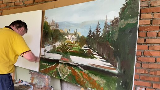 Подмалевок, Курортный бульвар и нарзанная галерея Кисловодск маслом на холсте 100 на 150 см. Зилавди Яшуркаев.