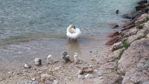 Лебедь с маленькими лебедятами. Лебедь прогоняет селезня