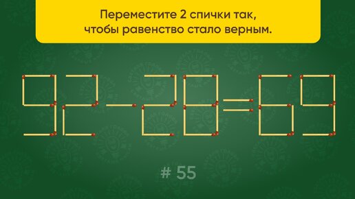 Задача со спичками № 55. Переместите 2 спички так, чтобы равенство стало верным.